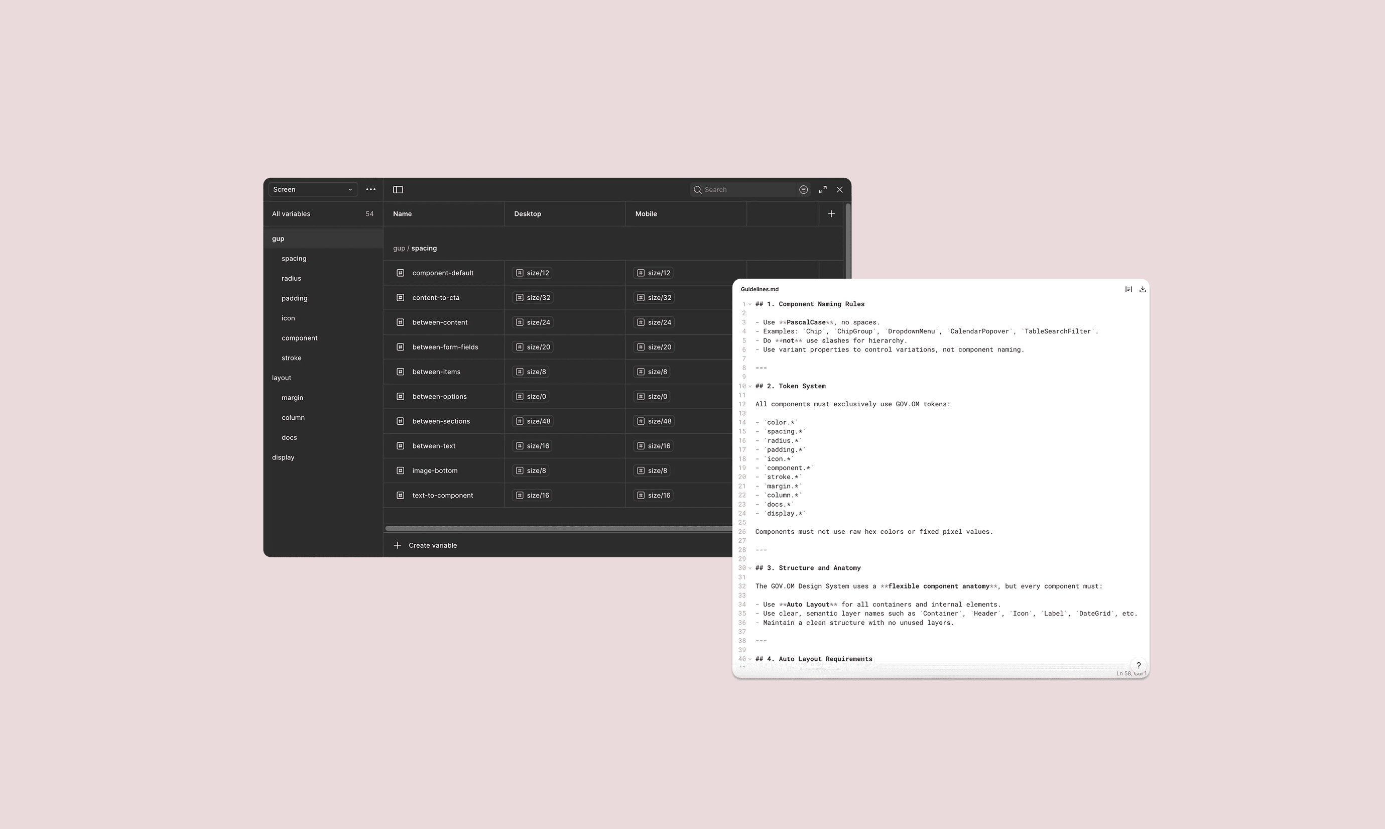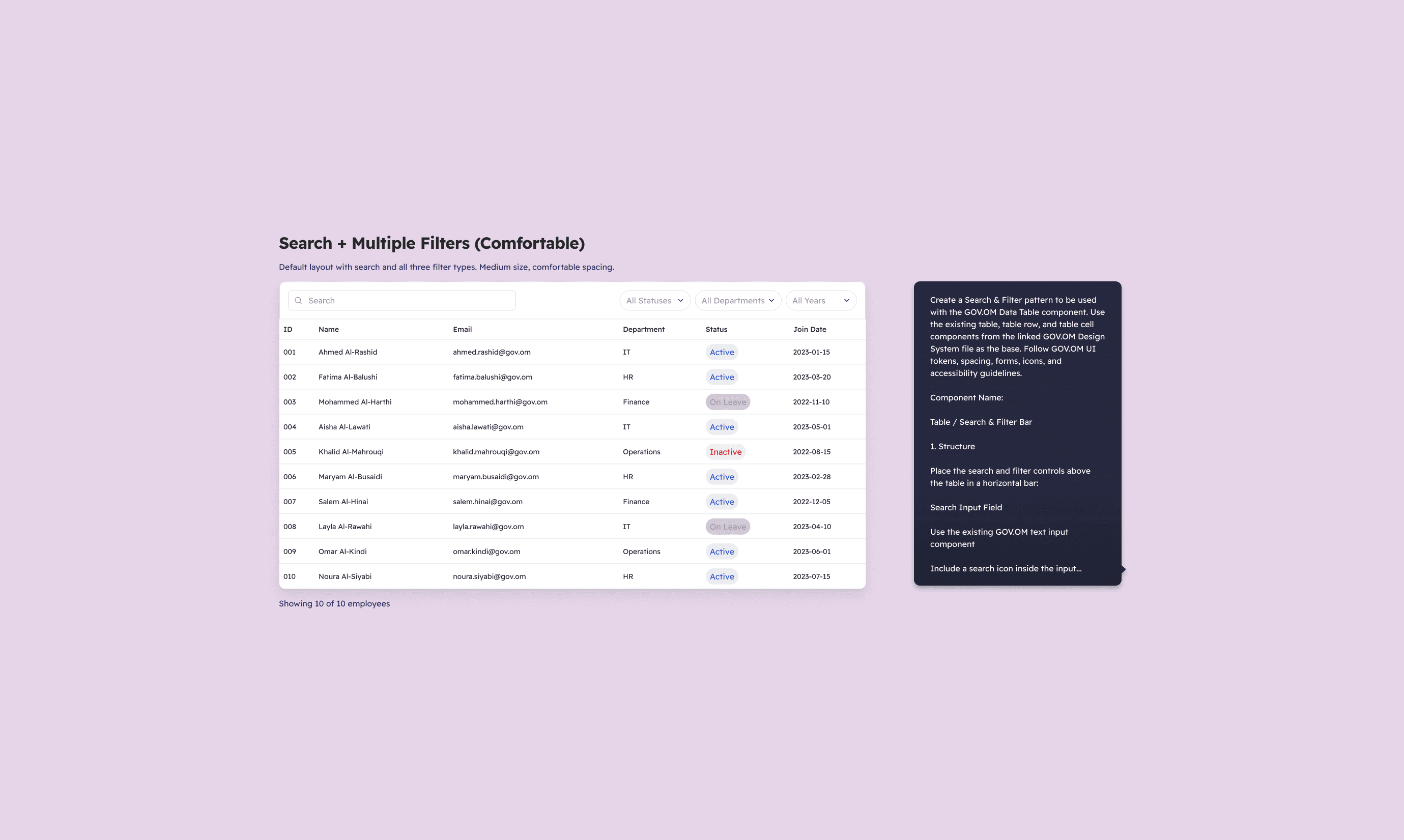 While building them, we identified a deeper issue. Components were duplicated across ministries, variants were inconsistently structured, and design-to-development handoff was slow. Complex elements like Data Tables could take up to six working days to design and five days to develop.